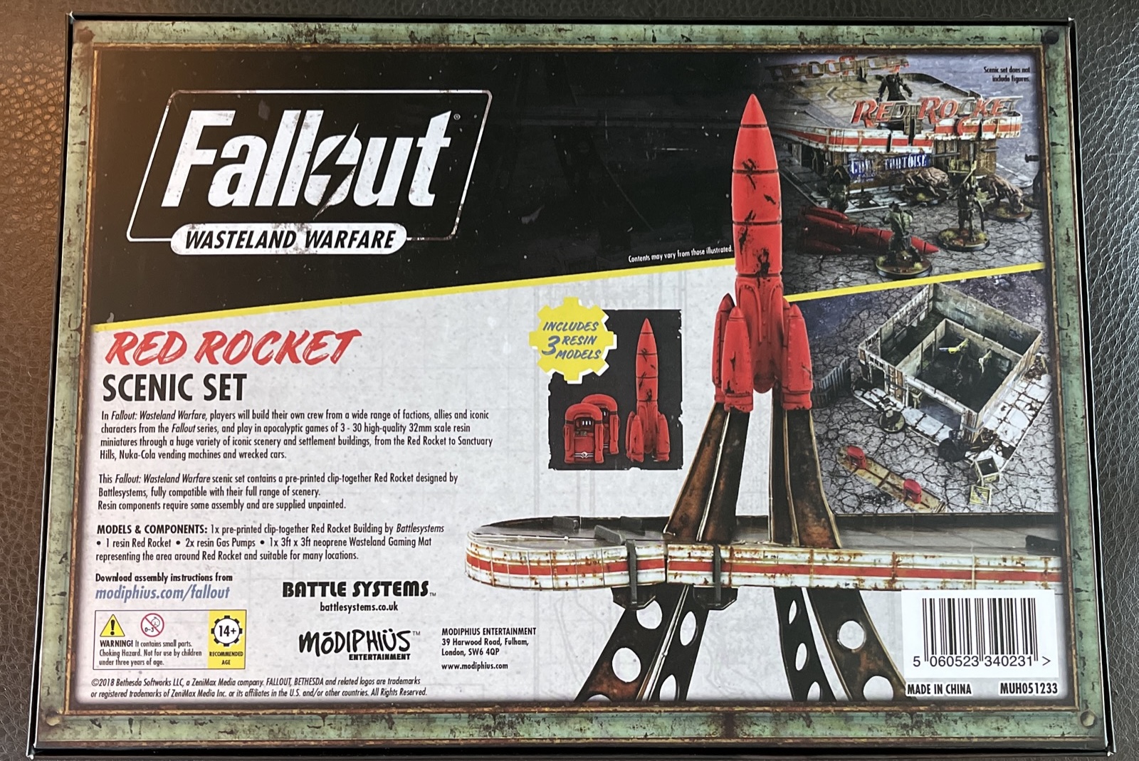 Enhance your gaming experience with this stunning Fallout Wasteland Warfare RED ROCKET scenic set, complete with a gaming mat. Immerse yourself in the post-apocalyptic world of Fallout and prepare for battle with this rare and highly sought-after set. Perfect for collectors and gamers alike, this set is sure to impress and provide hours of entertainment.